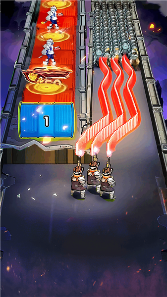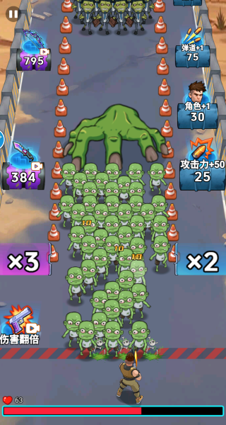 3、越到后面出现的僵尸数量就会越多,玩家可以利用场上的道具来帮忙击杀僵尸,只需要移动角色到最左边或是右边即可。