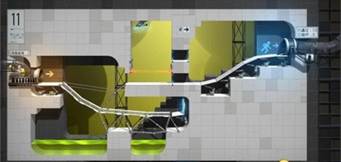 这一关的难点在于入口处预先设置的桥梁其实是个“障眼法”,很容易误导玩家,正确的做法是先把出口的桥毁掉,让桥的路径引导到中部下方的蓝色传送门那里。