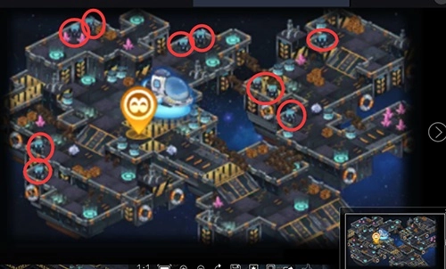 不过,激活房间需要用到芯片。我们可以依据剧情任务的提示,去收集地图上出现的芯片。按照之前提到的省力办法,收集7个芯片就足够了。下面这张图展示的是能采集到芯片的大致区域,因为这次小地图打开后分成了三个区域,所以原图有点小。为了让大家看清楚采集区域,我特意把图放大了,所以看起来有些模糊。