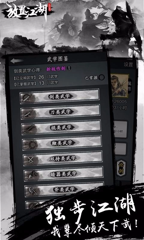 放置江湖是一款文字向角色扮演游戏,它具有非常精湛的游戏画风,以文字、插画的方式讲述一个刀光剑影的江湖世界,浓厚的水墨画风格为玩家塑造古韵古色的场景,在这里,你可以抒写你的武林神话,开启全新传奇篇章;游戏玩法总体来说比较轻松休闲,主要以放置微操为核心,加上丰富文字剧情,让玩家体验到截然不同的江湖冒险之旅;这里拥有超多江湖奇遇事件等你来解开,开放式故事剧情,玩家将可以自己改写剧本,自己当导演编剧,开创全新江湖世界,喜欢的话就来本站。