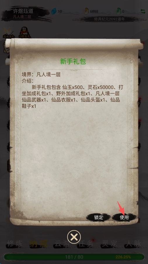 5、点击屏幕右下角的“使用”按钮,就能获取基础装备啦,拿到后别忘了装备上,可别用完礼包就把这事儿抛到脑后哦。