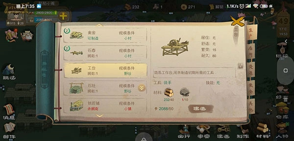 接下来就去收集40份木头和10份石头这两种材料,用来搭建工台。等工台建好了,就能制作工具了——比如木镰刀,它的采集效率能达到150%,用它采集材料会快不少,建议每个人都配一把。