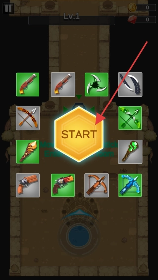 武器选择,选定武器后,点击【START】按钮,进入战斗场景,使用所选武器与敌人对抗,直至完成冒险。