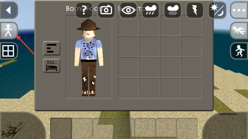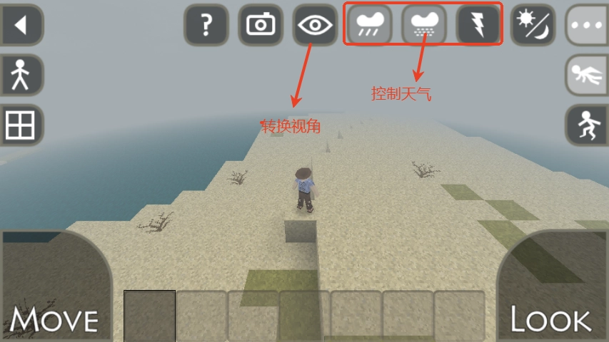 7、界面右上角设有天气控制按键,可切换雨天、阴天、晴天等不同天气效果;旁边的眼睛图标则用于调整游戏视角。