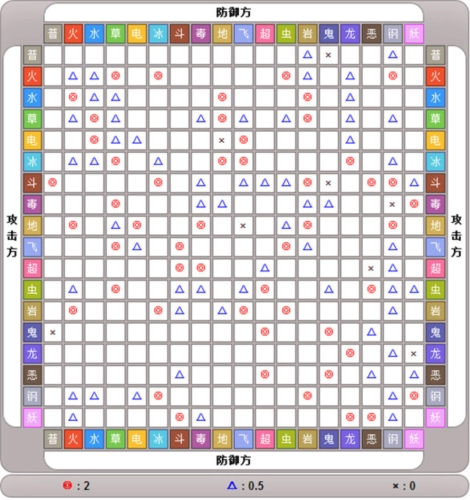 技能的属性和精灵的属性之间存在克制关系,具体的克制关系可参考口袋妖怪第六世代的18系别克制关系,其中1倍代表正常伤害、2倍意味着效果拔群、1/2倍表示收效甚微、0则说明技能无效。