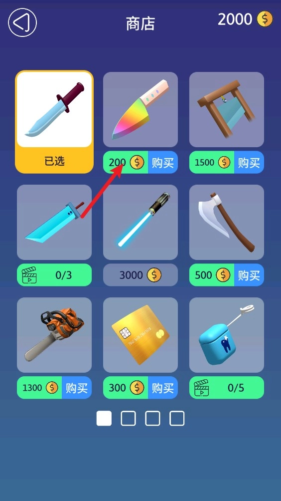 在关卡中,我们可以点击左上角的小刀图标进入商店,在商店里能够购买各式各样的刀来进行更换。