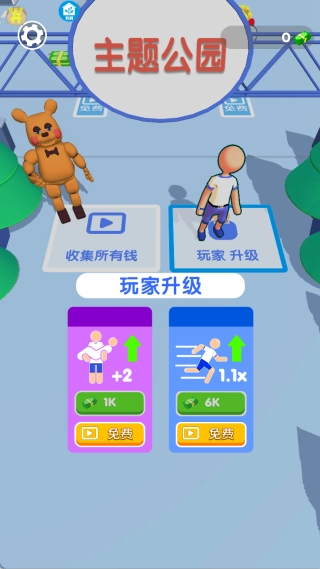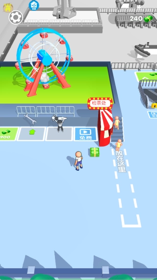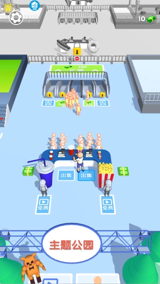 1、点击并拖动游客,将他们移动到设施入口排队游玩以获得收入。