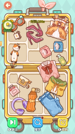 3.如下图所示,在行李归纳关卡中,玩家的任务是要将服饰等归纳到行李箱中的合适位置,在规定时间内清理完毕即可闯关。