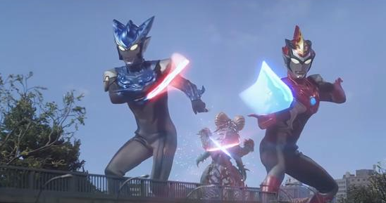 布鲁与罗索各自将能量汇聚于罗布头镖的刃部,从不同方向先后劈出月牙状的能量光束,两道光束交错形成十字形态,以此增强单次斩击的力量。兄弟二人的头镖剑气合二为一,一举对黑暗欧布奥特曼造成了沉重打击。