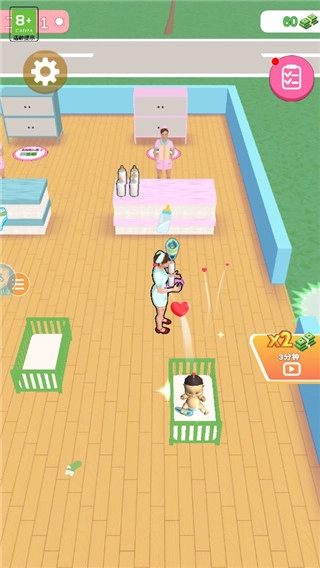 4、当你解决了问题后,就会有妈妈把孩子接走,并留下钱,走到旁边就可以捨取,获得金钱后可以移动到绿色图标上,这样会自动扣除金钱解锁新的婴儿床。