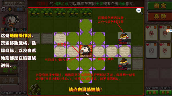 武将的兵力等同于其HP值,当兵力降至1以下时,需向其他武将请求支援。若求援未能成功,该武将将被击退。在弃牌阶段,每拥有100点兵力,武将可额外保留一张手牌。行动力方面,回合开始阶段会自动增加6点(部分坐骑可提升此数值),且本回合的行动力仅限当回合使用。选择目标地点移动时会消耗行动力,不同地形对应的消耗不同,部分地形甚至无法进行移动操作。