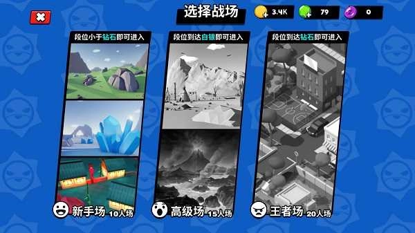 2、进入游戏后,点击“开始对战”选项。接下来,玩家能够依据自身段位选择对应的战场:若段位低于钻石,可进入新手场,该场次共有10人参与;当段位达到白银及以上时,可进入高级场,此场次参与人数为15人;而一旦段位达到钻石,则可进入王者场,该场次的参与人数是20人。