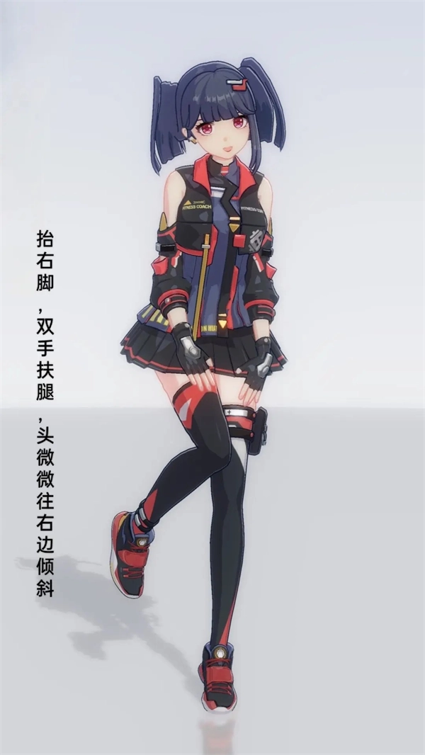 4、抬右脚,双手扶腿,头微微往右边倾斜