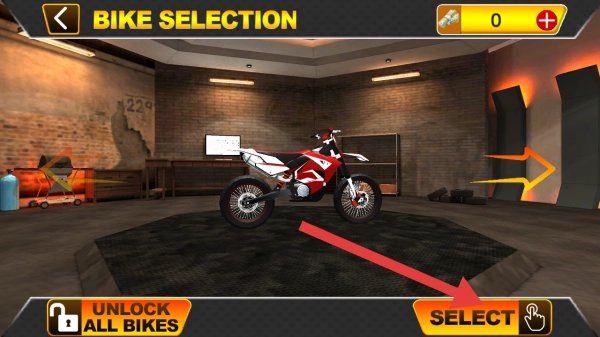 2、进入【BIKESELECTION】界面后,选择红色摩托车,点击【SELECT】按钮确认所选车辆,随后即可准备进入特技关卡。