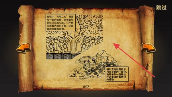 1、游戏剧情卷轴界面,呈现“大树之力”“图尔巴巴”等背景故事,点击箭头即可翻页,深入了解世界观设定。