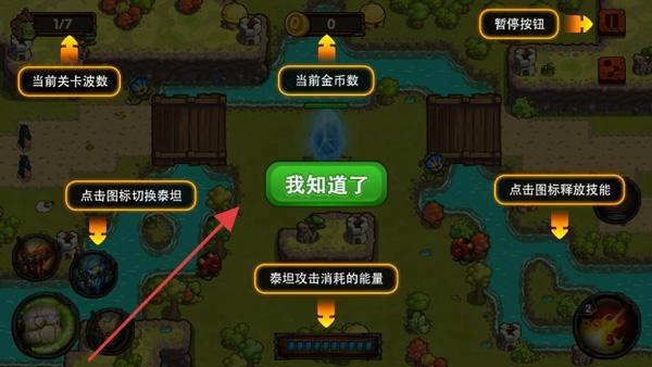 2、新手引导界面会介绍“当前关卡波数”“当前金币数”等功能,玩家点击“我知道了”即可推进游戏,该界面用于指导玩家操作。