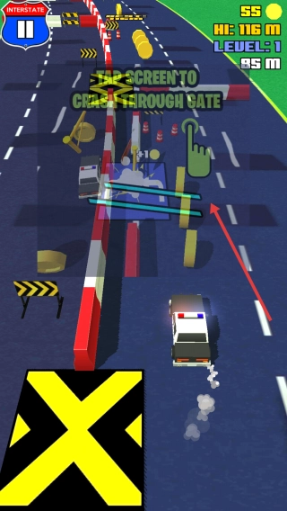 2、遇到类似“TAP SCREEN TO CRASH THROUGH GATE”这样的障碍时,点击屏幕将其撞开,同时要避开警车和路障。