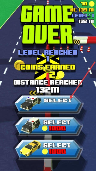 3、游戏结束后,用获得的2金币挑选新警车(比如免费款式),继续挑战更远的距离和更高的关卡。