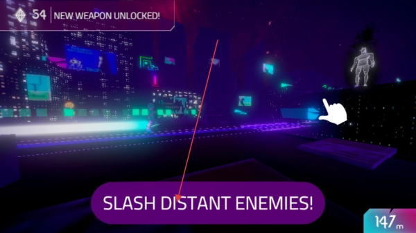 3、遇到敌人时,依据“SLASHDISTANTENEMIES!”提示操作,砍杀远处敌人,解锁新武器,提升战力。
