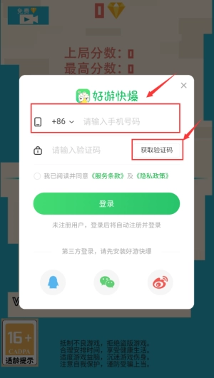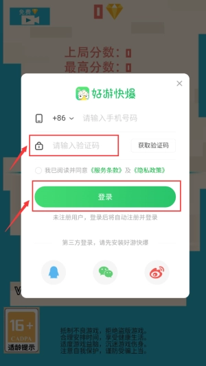 2、输入手机号码以获取验证码,勾选相关协议后,点击绿色的登录按钮即可。