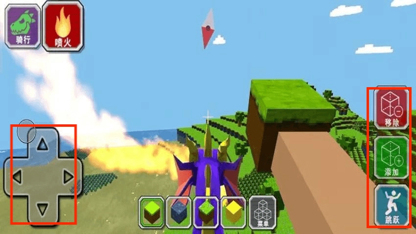 3、左下角的按钮用于操控角色移动,右下角的按钮则用于操控人物放置方块。