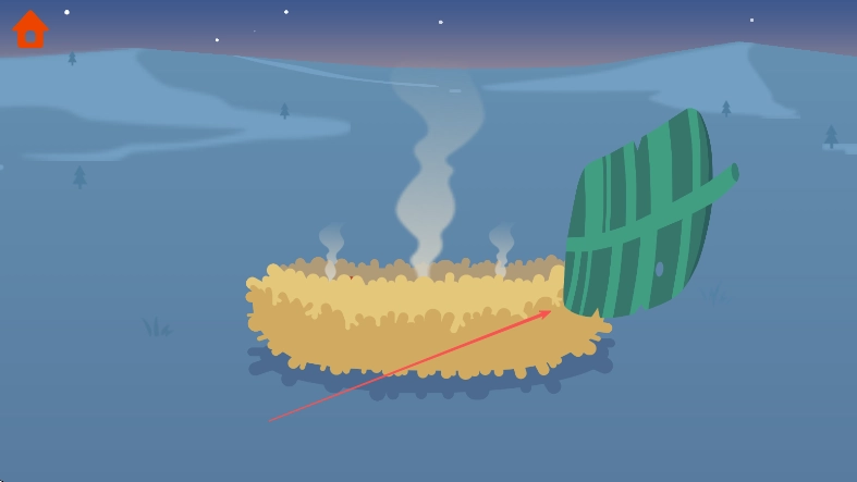 1、进入生火的场景后,能看到干草堆和竖放着的木头,需要通过快速点击木头的方式来摩擦取火。