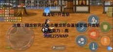 1、升龙斩:向前施展屠龙斩后,再次点击屠龙斩即可将招式切换为升龙斩。该招式破防能力极强,使用时会消耗250%的MP。