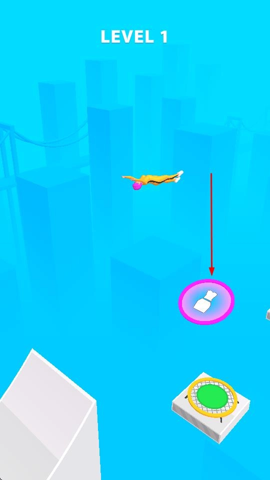 1、进入游戏后,操控角色在蓝色背景的城市环境中进行运动,首先从高处跳下,落在绿色的蹦床上,借助蹦床的弹力继续前进。