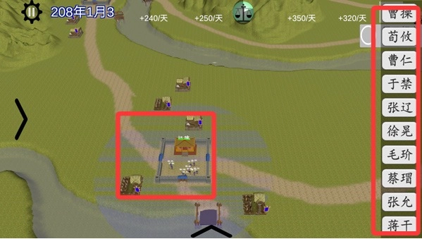 3、进入游戏后,点击己方阵营,即可挑选三国历史人物,并派遣士兵对其他阵营发起进攻。