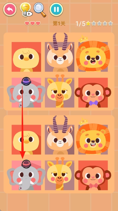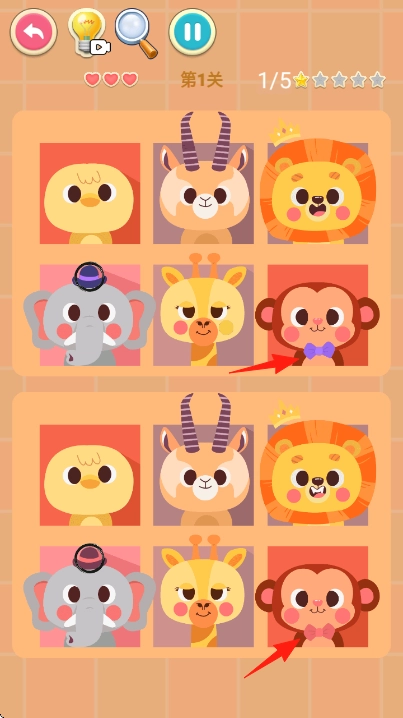 1、仔细观察上下两排动物,找出它们之间存在差异的位置。比如戴帽子的大象,其帽子样式有所不同,按照箭头的指示,将这个不同之处点击圈选出来。