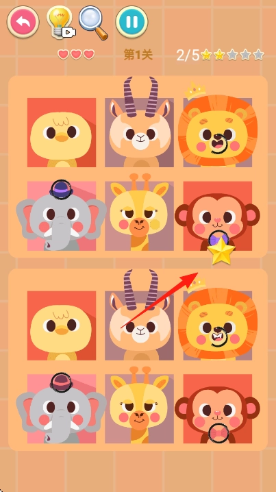 3、每成功找出一处不同之处,比如大象的帽子、老虎的牙齿,就能获得星星,此时进度会达成2/5,接下来继续找出剩余的不同之处,即可通关该关卡。