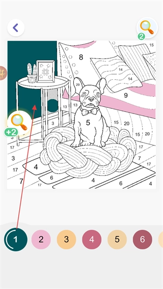 4、点击数字5,为小狗身上标有5的区域涂色,逐步完成图案的填充。