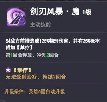 对敌方前排造成125%物理伤害,并有35%概率附加【禁疗】