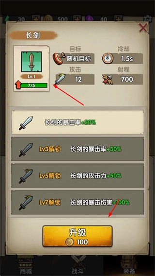 4、升级装备,消耗金币提升装备属性,增强战斗力,持续合成、获取资源、升级装备,朝着抵御更多波次敌人的目标努力。