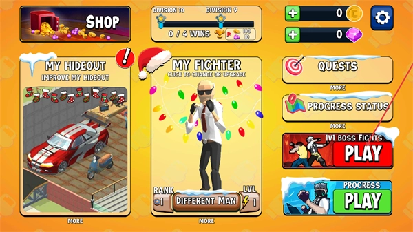 1、在游戏主界面中,找到右侧1V1BOSSFIGHTS模块下的PLAY按钮并点击,即可进入对手选择界面,当前己方角色为DIFFERENTMAN等级1。
