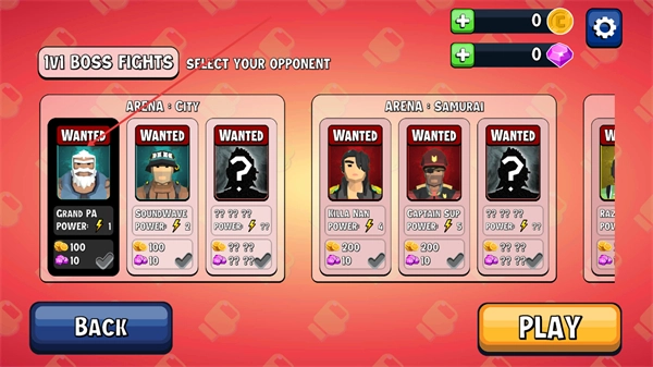 2、进入1V1BOSSFIGHTS的对手选择界面后,选择ARENA:CITY下的第一个对手GRANDPA,接着点击底部的PLAY按钮进入对战环节。