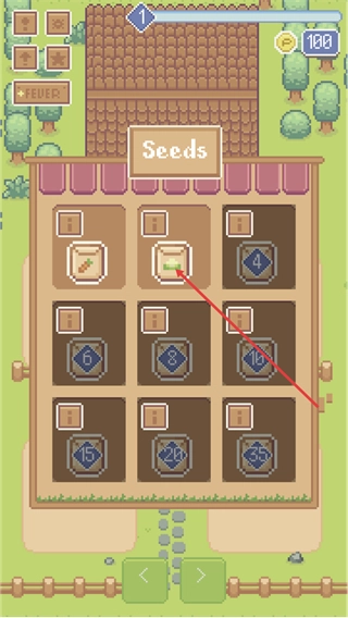2、在种子商店的Seeds界面里,挑选对应的种子道具,就能为在空地种植该种子做好准备。