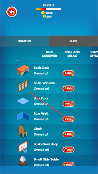 2、进入FURNITURE界面,找到BasicDesk、BlueWall等物品,消耗对应数量的金币即可获取,通过这种方式解锁可用于装饰空间的家具。