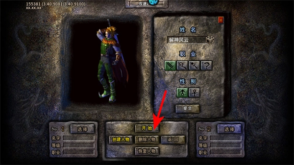 1、进入游戏角色界面后,点击红色箭头指向的开始按钮,进入游戏的主场景,这是开启冒险的关键操作。