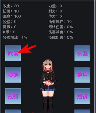 进入角色界面后,点击红色箭头所指的武器选项,这是开启装备系统操作流程的关键步骤,也是提升实力的重要操作。
