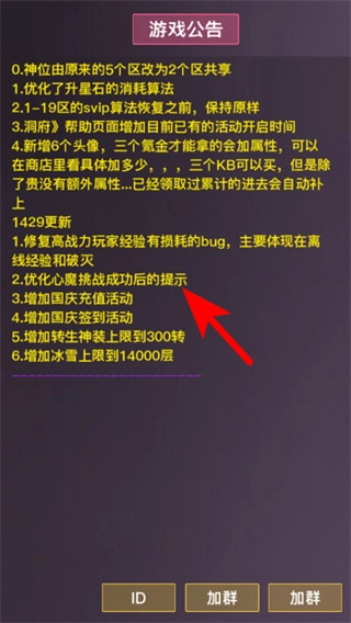 3、按照红色箭头的指引,查看游戏公告的具体内容,以便知晓版本更新、活动开启等相关信息,从而能及时参与各类福利活动。
