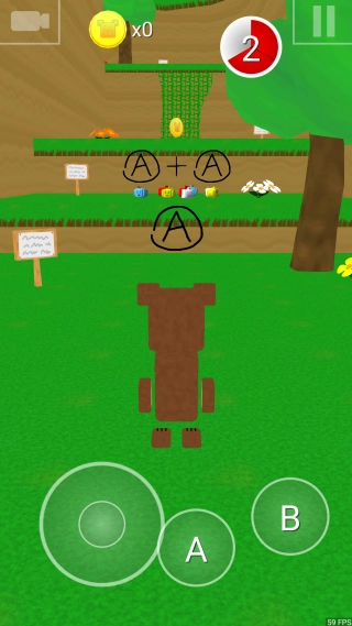 先按下“B”键的同时配合“ A“ 键(B+A操作),帮助小熊跳到上方平台,在此过程中收集金币,要留意避开障碍物,借助按键组合来实现地形的跨越。