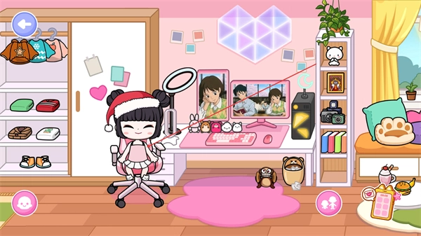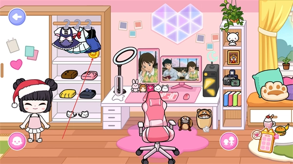1、在房间内互动,操作角色更换装扮,搭配服饰,装饰房间,推进玩法。