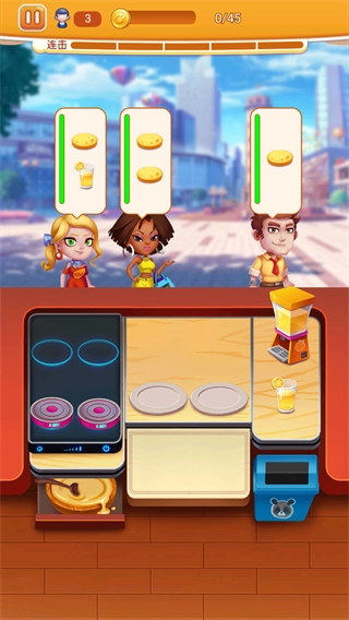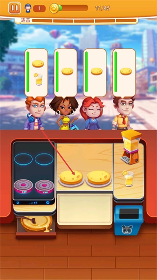 2、进入关卡后,观察顾客头顶的需求物品,点击操作台面上对应的食物如芝士蛋糕类食品,将其交付给对应顾客以完成订单。