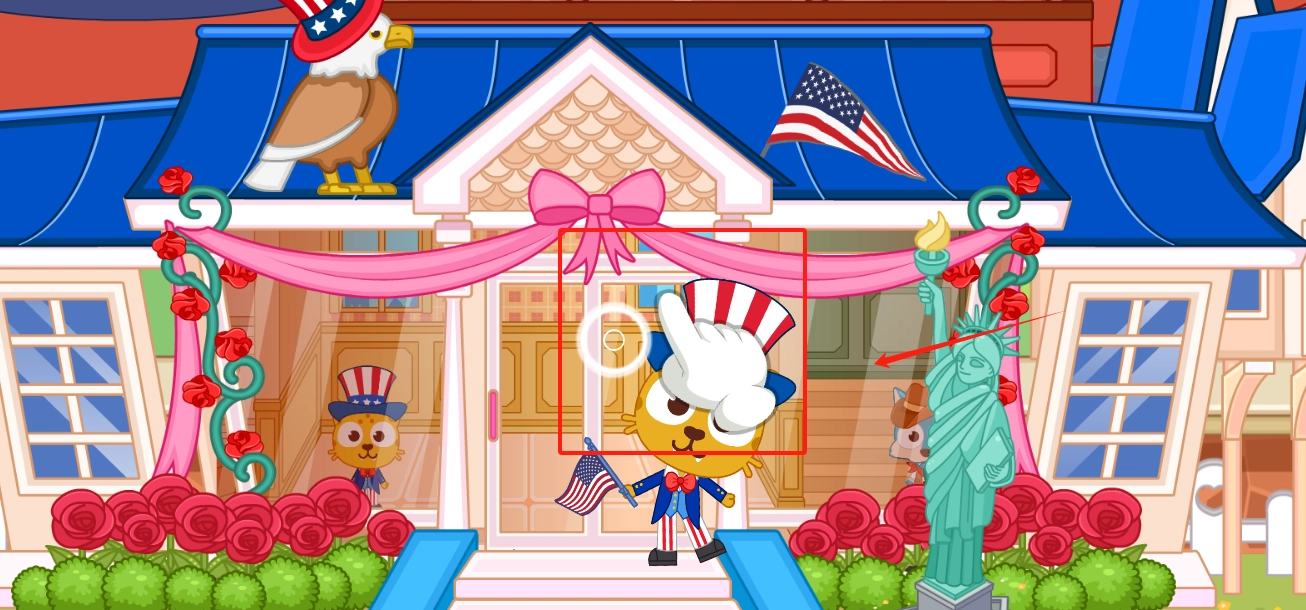 2、看到戴着星条旗帽子的小动物和自由女神像时,点击红框里的小动物就能进行互动啦。
