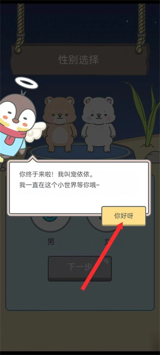 在性别选择的界面中,点击那个被红色箭头所指向的“你好呀”按钮,以此完成和NPC之间的对话互动,从而推动角色创建流程的进行。
