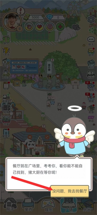 在广场的对话界面里,点击那个被红色箭头指向的“没问题,我去找餐厅”按钮,就能响应NPC的指引,从而推进养成任务的进度。