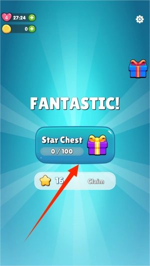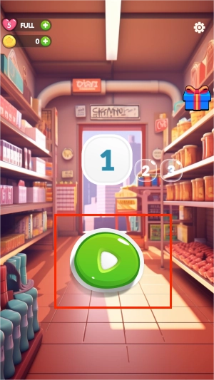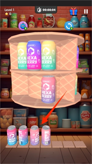 1、游戏启动后,轻点屏幕底部闪烁的箭头图标,货架上就会立刻出现色彩缤纷的饮料瓶整齐排列。