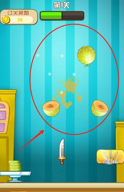 1、开始游戏,手指一划西瓜爆汁,"唰唰"的音效配上炸裂特效爽到飞起。