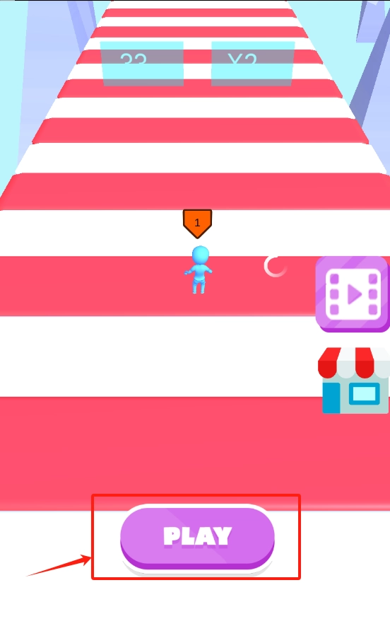 1、点击紫色的PLAY按钮,操纵蓝色小人在跑道上起跑,力求获得更高分数。